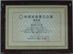すでに高い付加価値を創出している企業に加えて、自治体や商工団体、金融機関等の各関係者から推薦を得た、新たな地域の牽引役となり得る魅力ある事業に取り組む企業として、(株)キクノが経済産業省により「地域未来牽引企業」に選定されました。