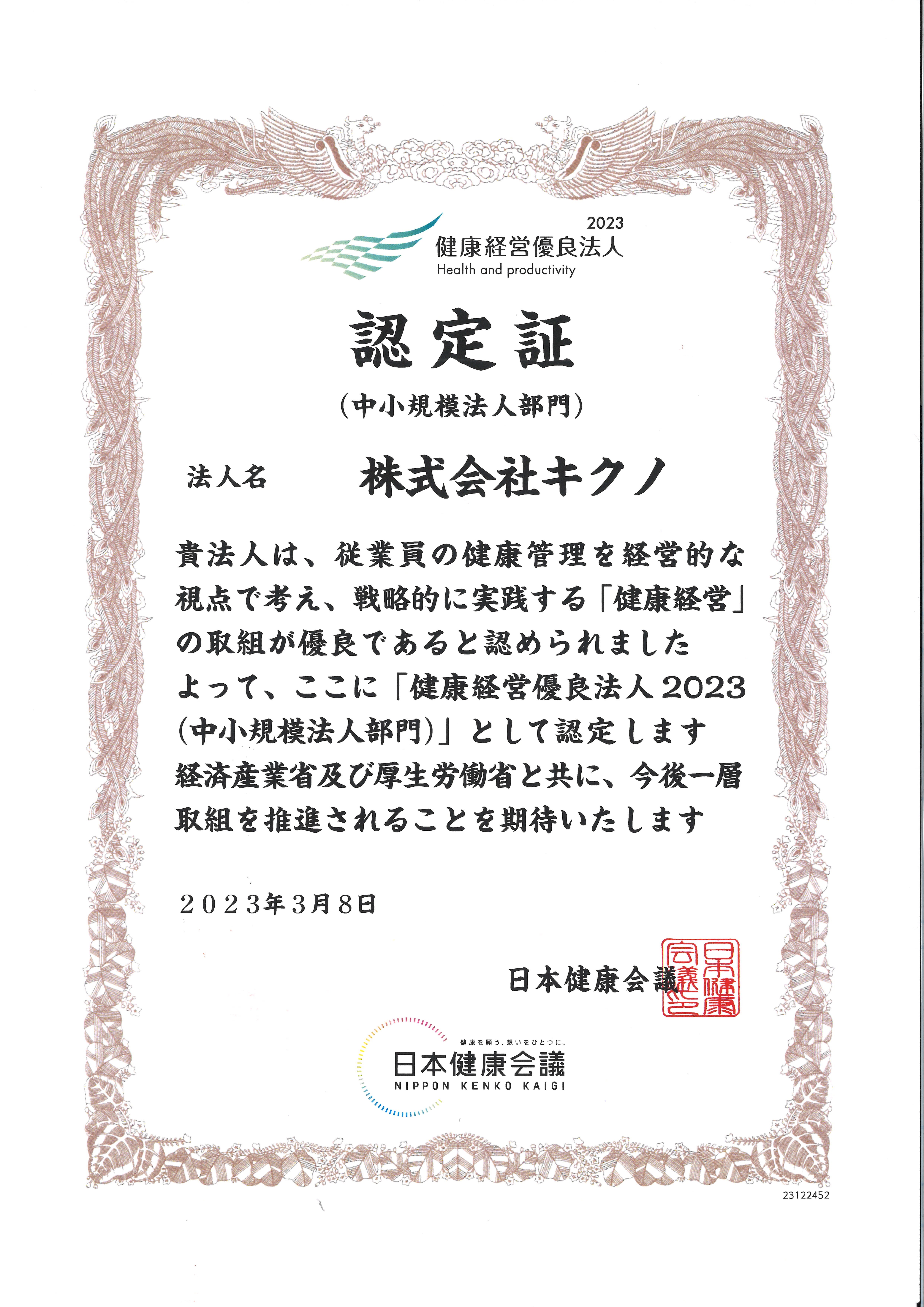 (株)キクノが健康経営優良法人2023(中小規模法人部門)に認定されました。
